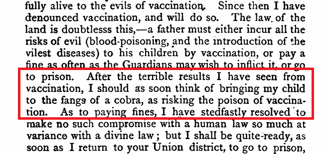 The following was written by Rev. Postlethwaite in opposition to vaccine mandates in 1876 at a Meeting of the Ulverston Board of Guardians. Vaccination was a deadly equivalent to the bite of a cobra, and opposed to God’s law: